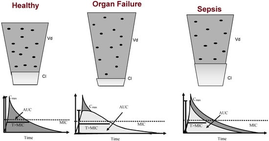 Changes in pharmacokinetics of drugs (including antibiotics) in critically ill patients. During organ failure, changes in water metabolism often lead to an increase in the volume of distribution and a lower concentration. Conversely, clearance is commonly decreased, and a longer half-life is expected. In sepsis, both the volume of distribution and clearance may be increased, and all pharmacokinetic/pharmacodynamic targets are decreased. Vd—Volume of distribution; Cl—Clearance; Cmax—Maximum peak concentration; AUC—Area under the curve; T > MIC—Time above minimal inhibitory concentration (adapted from []).