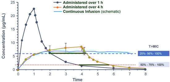 In critically ill patients, higher targets have been proposed, especially for β-lactams, including 100% of the time over a concentration as high as 4 × MIC []. Consequently, extended or even continuous infusions of these antibiotics have been proposed to be able to achieve these higher targets and improve clinical outcomes (Figure 2). However, theoretically, the plateau concentration of β-lactams, which is associated with continuous infusion, may be below the efficacy threshold 100% of the time, and this could lead to the worst outcome.