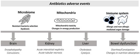 We briefly discuss nephrotoxicity as well as neurological damage and focus on the adverse events associated with direct mitochondrial impacts, dysbiosis, and microbiome impairment. Overall, these toxicities are frequently ignored in conventional clinical practice or attributed to sepsis itself. However, they might be responsible for most of the adverse effects that are observed or even for persistent organ dysfunction in critically ill patients [].