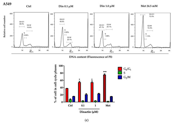 To investigate the mechanism of how dinactin inhibits cellular proliferation, we evaluated its effect on cell cycle progression. Lu99 and A549 cells were treated with 0.1 and 1 µM of dinactin at 48 h, and the percentage of cell cycle distribution in the G0/G1, S, and G2/M phases was analyzed using flow cytometry. Metformin, a type 2 diabetes treatment agent, was used as a positive control for cell cycle arrest at the G0/G1 phase at a concentration of 24.5 mM [22]. We found that dinactin induced cell cycle arrest at the G0/G1 phase and moderates the cell cycle checkpoint similar to metformin.
