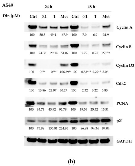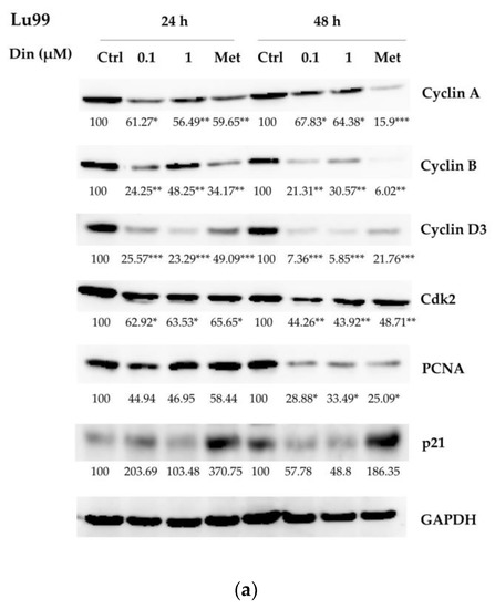 2.2. Dinactin Down-Regulated Cyclins A, B, and D3, cdk2 and PCNA in Lu99 and A549 Cells