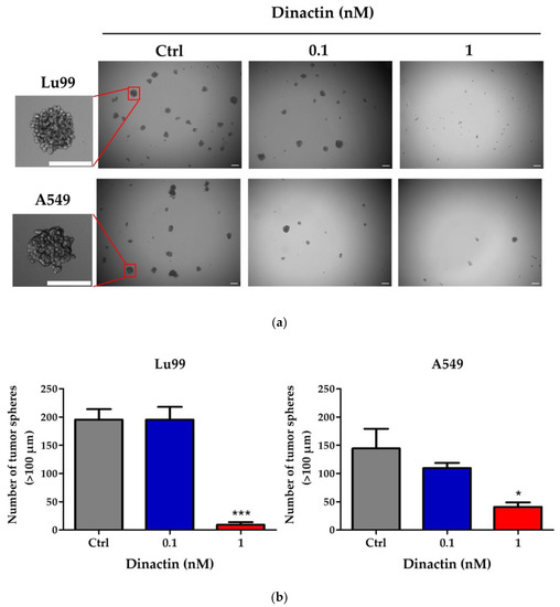 Dinactin reduced the size of tumor-spheres in Lu99 and A549 cells.