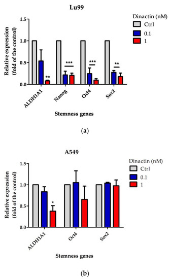 Next, we investigated the inhibitory effects of dinactin on cancer stemness properties by tumor-sphere formation assay. Lu99 and A549 cells were cultured under non-attached and serum-free CSCs culture medium in the presence of 0.1 and 1 nM of dinactin for 14 days. The number of tumor-spheres greater than 100 µm was counted and kept for RNA extraction. As shown in Figure 3a,b, non-treated Lu99 cells produced 195.5 ± 45.3 tumor-spheres (control), whereas treatment with 0.1 and 1 nM of dinactin inhibited tumor-sphere formation by 195.3 ± 39.3 and 9.33 ± 11.3 (95.2% inhibition), respectively. In A549 cells, similar results were obtained: treatment with 0.1 and 1 nM of dinactin inhibited tumor-sphere formation from 144.5 ± 69.5 to 109.7 ±15.9 (24.1% inhibition) and 41.0 ± 15.8 (71.6% inhibition), respectively. Furthermore, dinactin reduced the size of tumor-spheres, as shown in Table 1. At a concentration of 1 nM of dinactin, the average size of tumor-spheres was reduced from 175.54 ± 55.78 µm to 128.82 ± 20.07 µm (26.6% inhibition) in Lu99 cells and from 158.72 ± 47.40 µm to 134.87 ± 25.71 µm (15.0% inhibition) in A549 cells. These are new findings that highlight the very low concentration of dinactin (1 nM) capable of inhibiting CSC in NSCLC cells.
