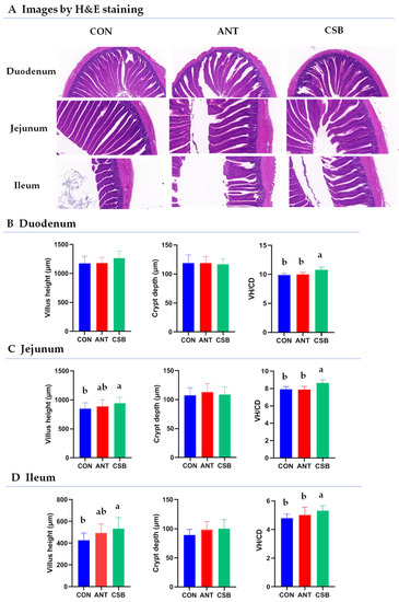 The morphology of the small intestine was determined by H&E staining. The villus height (VH), crypt depth (CD) and villus height/crypt depth (VH/CD) ratio of the small intestine in broilers at 21 d of age were measured (Figure 1). The VH/CD ratio in the duodenum, jejunum, and ileum for broilers fed the CSB diet was significantly higher (p < 0.05) than that of those fed CON and ANT diets. There was no significant difference in the duodenal, jejunal, and ileal VH/CD ratio between the CON and ANT groups. The VH in the jejunum and ileum in the CSB group was significantly higher (p < 0.05) than that in the CON group. There was no significant difference in duodenal VH among the three groups. In addition, the CD in the duodenum, jejunum, and ileum had no significant difference among the three treatments.