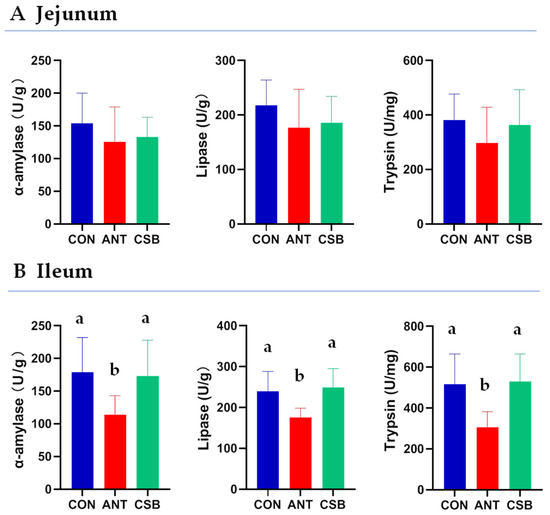 To examine the effect of CSB on the digestion of the small intestine, the intestinal digestive enzymes were determined in 21 d-old broilers (Figure 2). The activities of α-amylase, lipase, and trypsin in the jejunal chyme had no significant difference among the three treatments. Compared with the ANT diet, the activities of α-amylase, lipase, and trypsin in the ileal chyme of broilers fed CSB and CON diets were significantly increased (p < 0.05), while there was no obvious change between the CON and CSB groups.