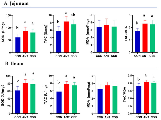 To examine whether CSB improves the antioxidant capacity of small intestine mucosa in broilers at 21 d of age, the superoxide dismutase (SOD), total antioxidant capacity (TAC), malondialdehyde (MDA) and the ratio of TAC to MDA (TAC/MDA) were determined (Figure 3). The SOD of the jejunual and ileal mucosa was significantly higher (p < 0.05) in the CSB and ANT than in the CON. Compared with the CON, the TAC of the jejunal mucosa significantly increased (p < 0.05) in the ANT and tended to increase (0.05 < p < 0.1) in the CSB, and the TAC of the ileum mucosa significantly increased (p < 0.05) in CSB and ANT. However, MDA were not significantly affected by CSB and antibiotics supplementation. Furthermore, the TAC/MDA (antioxidant balance) was significantly increased in the CSB and ANT compared with the CON.