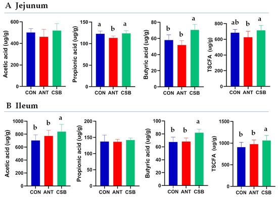 Concentrations of AA, BA, and TSCFA in the ileal chyme of broilers fed the CSB diet were markedly higher (p < 0.05) than those fed CON and ANT diets. However, concentrations of AA, BA, and TSCFA in the ileal chyme were not significantly different between the CON and ANT groups. In addition, there was no significant difference in PA concentration among the three groups.