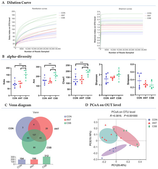 Effects of CSB addition on the microbial diversity of ileum in broilers at 21 d of age (n = 6). ** 0.001 < p ≤ 0.01.