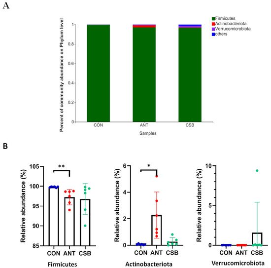Furthermore, we analyzed the microbial community in the ileum chyme at the phylum and genus levels, as shown in Figure 6. Firmicutes is the predominant phylum of ileum, accounting for more than 96% of the total sequences (Figure 6A). Furthermore, the main bacterial phyla among three groups were compared (Figure 6B). Compared with the ANT (97.25%) and CSB (96.80%), the relative abundance of Firmicutes was the highest (99.81%) in the CON (p < 0.05). However, the relative abundances of Verrucomicrobiota and other phyla in the CSB were the highest compared with the CON and ANT. In addition, the relative abundance of Actinobacteriota significantly increased in ANT (p < 0.05), from 0.06% in the CON and 0.32% in the CSB to 2.27% in the ANT.