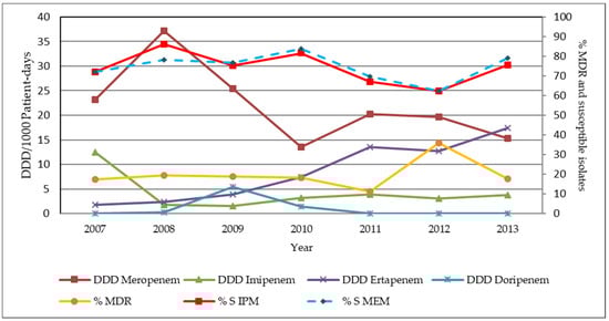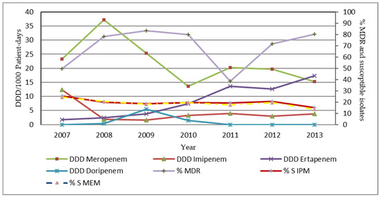 - Sousa, D.; Castelo-Corral, L.; Gutiérrez-Urbón, J.M.; Molina, F.; López-Calviño, B.; Bou, G.; Llinares, P. Impact of ertapenem use on Pseudomonas aeruginosa and Acinetobacter baumannii imipenem susceptibility rates: Collateral damage or positive effect on hospital ecology? J. Antimicrob. Chemother. 2013, 68, 1917–1925. [Google Scholar] [CrossRef][Green Version]