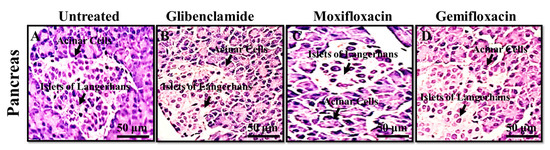 No significant changes in the cellularity and density of the beta cells of the pancreas were observed in all the treated groups as we administered the test (Moxifloxacin, Gemifloxacin) and standard (Glibenclamide) drugs for 5 days (Figure 1).