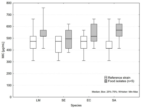 The differences between the reference strain and the mixture of food isolates (Figure 1) were statistically significant for all the species except Salmonella Enteritidis. The most pronounced difference was found for S. aureus (p < 0.001) with median 414 µg/mL for reference strain and 569 µg/mL for mixture of food isolates. These differences were not affected by the type of growth medium or essential oil. The use of mixture of contemporary food isolates represents a worst-case-scenario, where the most resistant strain will prevail. Since testing of numerous isolates individually is laborious, this approach may bring more precise results than the use of a single reference strain, although well defined.