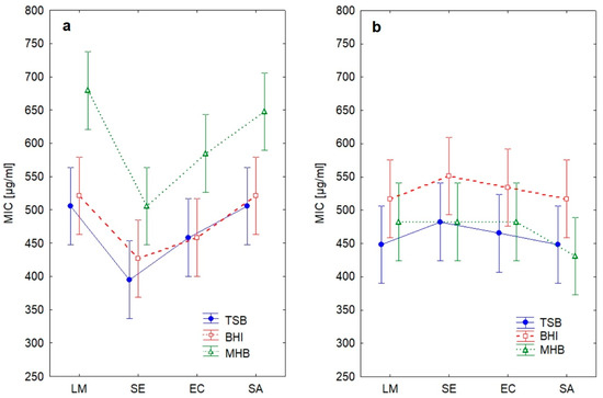 Differences in MIC between essential oils, growth media and pathogens (LM, Listeria monocytogenes; SE, Salmonella Enteritidis; EC, Escherichia coli O157; SA, Staphylococcus aureus). (a) Oregano essential oil; (b) cinnamon essential oil.