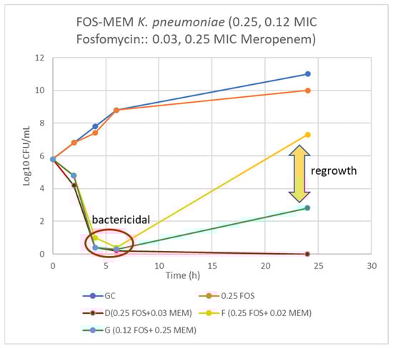 Time-kill curve of K. pneumoniae (Kp 4) using 0.25 and 0.12 MIC fosfomycin alone and combined with 0.03, 0.02, and 0.25 MIC meropenem. D = bactericidal effect at 6–24 h, F = bactericidal at 6 h and G = bactericidal at 4–6 h and synergy at 24 h incubation.