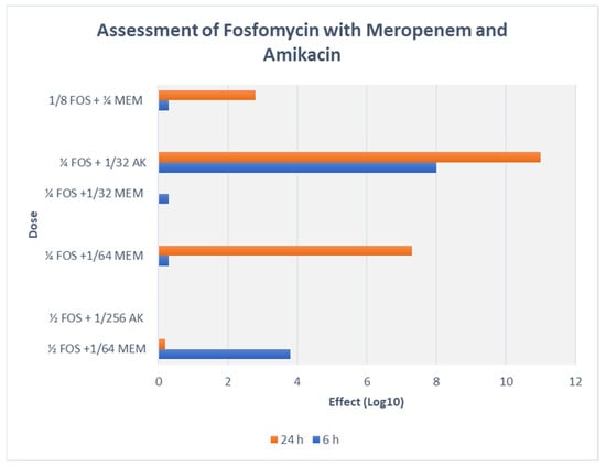 TKA demonstrated that the FOS-AK combination had even greater bactericidal activity than FOS-MEM. The bactericidal activity of 32 mg/L fosfomycin plus 4 mg/L amikacin against the representative XDR K. pneumoniae isolate was observed at 2 h and persisted for 24 h incubation. The superiority of amikacin over carbapenems has been reported against KPC-producing and amikacin-resistant OXA-48, NDM, and OXA-48 + NDM K. pneumoniae isolates [,]. Animal studies have demonstrated that the addition of FOS resulted in protective effect against aminoglycoside-related nephrotoxicity by inhibiting aminoglycoside-induced histamine release from mast cell destruction []. Since AK exhibits bactericidal activity in a concentration-dependent manner, this combination will allow a higher, once-daily AMK dosing if necessary []. However, keeping in mind, the poor penetration of AK into lungs, bones, brain, and bloodstream, FOS-MEM should be favoured in infections related to these sites.