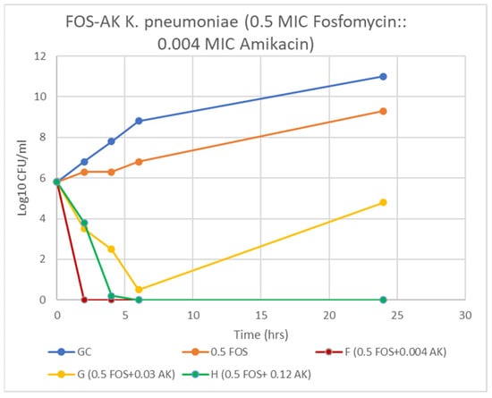 Time-kill curve of K. pneumoniae (Kp 5) at 0.5 MIC fosfomycin alone and combined with 4, 32, and 128 mg/L amikacin. F & H = bactericidal effect and G = a synergy at 24 h incubation.
