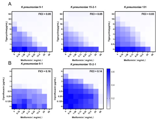 Synergistic activity of tigecycline and metformin against K. pneumoniae harbouring tmexCD1-toprJ1 or tet(A) mutation. (A) Chequerboard broth microdilution assays between metformin and tigecycline against K. pneumoniae. (B) Chequerboard broth microdilution assays between metformin and ciprofloxacin against K. pneumoniae. Dark-blue regions represent higher cell density and lower inhibition rate of combinational treatment. Data represent the mean OD (600 nm) of two biological replicates. Synergy is defined as an FIC index of ≤0.5.