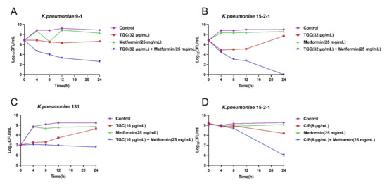 Overnight culture of each isolate was diluted 1:10,000 into fresh MH broth and incubated for 6 h at 37 °C under continuous shaking (200 rpm). Then, the culture was treated with TIG or metformin alone or their combination for 24 h. At the time points 0, 4, 8, 12, and 24 h, bacterial numbers were calculated with plate colony counting method. The concentrations of 16 µg/mL TIG and 50 µg/mL metformin was used for K. pneumoniae RGF131 while 32 µg/mL TIG and 25 µg/mL metformin was used for K. pneumoniae RGF15-2-1 and RGT9-1. MH broth with PBS were used as a negative control. Each experiment was performed with three biological replicates.