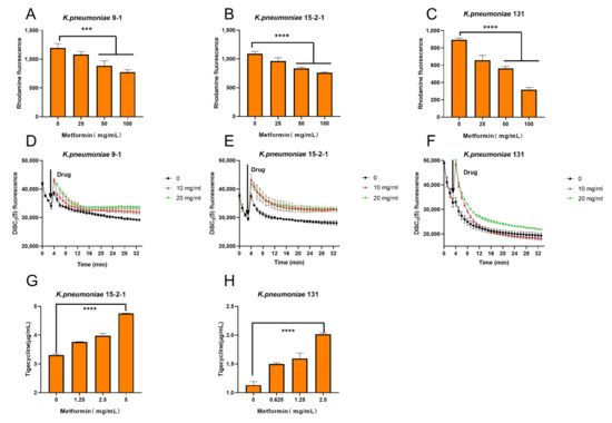 To elucidate the possible mechanisms of the synergy effect between metformin and TIG, the effect of metformin on the tmexCD1-toprJ1 and tet(A) efflux pump function was investigated. The capability of the tmexCD1-toprJ1 and tet(A) efflux pumps under the treatment of different concentrations of metformin was assessed with a rhodamine-based assay [15]. The effluxes of rhodamine was reduced in a dose-dependent way at the presence of metformin in all the three isolates (Figure 3A–C).