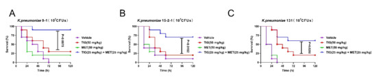 Galleria mellonella larvae was supplied by Huiyude Biotech Company (Tianjin, China). They were divided into 12 groups (n = 10 per group). All larvae were infected with 107 CFUs K. pneumoniae RGT9-1, RGF15-2-1 or RGF131 suspension, respectively. At 1 h post-infection, infected larvae were treated with PBS, TIG (50 mg/kg b.w.), metformin (50 mg/kg b.w.), or the combination of TIG with metformin (25 + 25 mg/kg b.w.). The survival rates of each group were recorded for 5 days.
