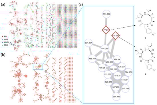 - Yang, J.Y.; Sanchez, L.M.; Rath, M.; Liu, X.T.; Boudreau, P.D.; Bruns, N.; Glukhov, E.; Wodtke, A.; de Felicio, R.; Fenner, A.; et al. Molecular Networking as a Dereplication Strategy. J. Nat. Prod. 2013, 76, 1686–1699. [Google Scholar] [CrossRef]