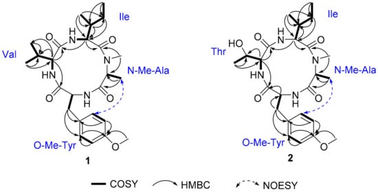 Compound 2 was isolated as a white amorphous powder. It was assigned a molecular formula of C24H36N4O6 (9 degrees of unsaturation) based on its HRESIMS and NMR data (Table 2). The 1D NMR spectroscopic data showed that compound 2 was a cyclic tetrapeptide similar to 1 but bearing a threonine (Thr) residue with signals at δH/δC 1.38 (3H, d, J = 6.9 Hz)/30.9 (CH3), δH/δC 4.42 (1H, overlapped)/65.4 (CH), δH/δC 4.81 (1H, m)/68.1 (CH), and δC 173.5 (C), instead of the valine residue. A comprehensive analysis of its relevant 1H-1H COSY, HMQC, HMBC, and NOESY correlations (Figure 3), and the ESI-MS/MS experimental results (Figure 4 and Figure S5) confirmed that 2 has the same planar structure as that of violaceomide A []. However, the optical rotation data of 2 ([α = +249.5, c = 1.0, MeOH) were opposite to that of violaceomide A ([α = −230.0, c = 0.6, MeOH), implying that they are optical isomers. The HPLC analysis of the acid hydrolysate of 2 after derivatization with l-FDAA revealed that l-N-Me-Ala, l-Ile, l-Thr, and d-O-Me-Tyr were present in 2 (Figure S6). This result shows that the main difference between compound 2 and violaceomide A is the substitution of l-O-Me-Tyr with d-O-Me-Tyr. Thus, compound 2 was assigned as cyclo-[l-N-Me-Ala-l-Ile-l-Thr-d-O-Me-Tyr] and named westertide B.