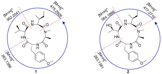 The amino acid sequence of 1 was deduced from the observed key HMBC correlations, NOESY correlations, and MS data. The HMBC correlations from N-CH3 (δH 3.32) of Ala to the Ile carbonyl group C-5 (δC 171.2), from H-6 (δH 5.17) of Ile to the Val carbonyl group C-11 (δC 173.0), and from H-12 (δH 4.31) of Val to the O-Me-Tyr carbonyl group C-16 (δC 174.1) suggested a partial sequence of N-Me-Ala-Ile-Val-O-Me-Tyr (Figure 3). The H3-4 (δH 1.43) of N-Me-Ala showed an NOESY correlation with H-20/24 (δH 7.29), indicating that 1 was a cyclic peptide, and this conclusion was also confirmed by the 9 degrees of unsaturation and the molecular formula. Additionally, the ESI-MS/MS experimental results (Figure 4 and Figure S4) also confirmed the connections of these residues as cyclo-[N-Me-Ala-Ile-Val-O-Me-Tyr].
