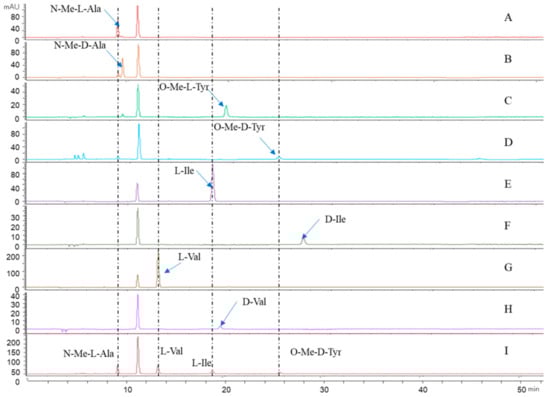 Advanced Marfey’s analysis of compound 1. (A–H): The retention times for the FDAA derivatives of N-Me-l-Ala, N-Me-d-Ala, O-Me-l-Tyr, O-Me-d-Tyr, l-Ile, d-Ile, l-Val, and d-Val, respectively. (I): The FDAA derivatives of the hydrolysate of 1. The derivatives of the acid hydrolysate and the standard amino acids were subjected to RP HPLC analysis (Kromasil C18 column; 5 μm, 4.6 mm× 250 mm; 1.0 mL/min; UV detection at 340 nm) with a linear gradient of acetonitrile (35–45%) in water (TFA, 0.01%) over 40 min.