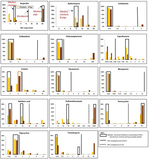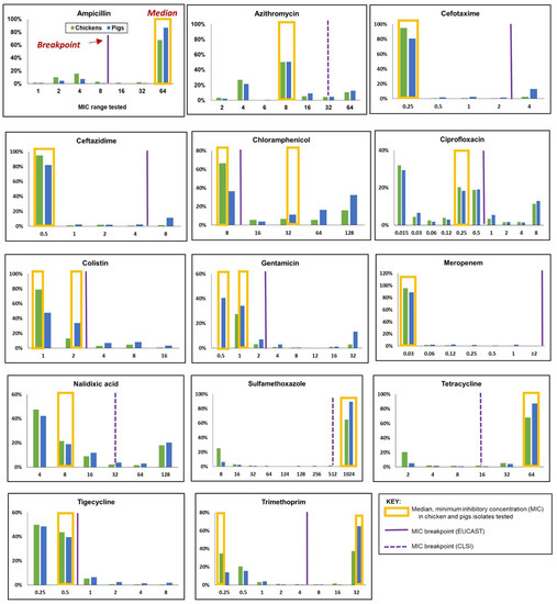 - United States Center for Disease Control and Prevention; National Antimicrobial Resistance Monitoring System for Enteric Bacteria (NARMS). Antibiotics Tested by NARMS. Available online: https://www.cdc.gov/narms/antibiotics-tested.html (accessed on 24 December 2021).