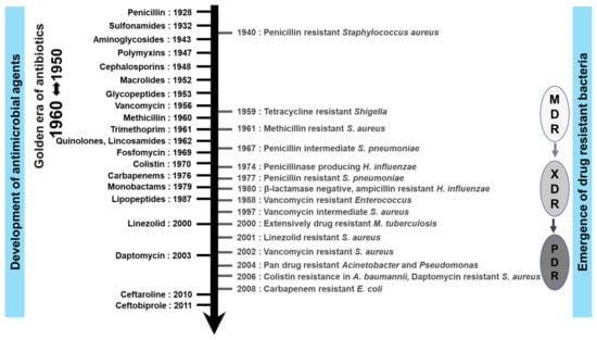 Timeline of eight decades of antimicrobials discovery alongside AMR emergence. MDR: multi-drug-resistant, XDR: extensively-drug-resistant, and PDR: pan-drug-resistant.