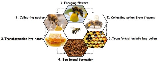 For honey bees, the nutrients necessary for the survival and maintenance of the health of colony populations come from two main sources, namely nectar/honeydew and pollen from flowers. Nectar and honeydew provide carbohydrates and pollen provides other dietary needs, such as lipids, proteins, vitamins, and minerals [4]. However, bees do not directly consume nectar/honeydew or pollen; in both cases, they induce biochemical changes, such that the nectar/honeydew turns into honey and the pollen turns into bee bread [5]. The process of making bee bread begins with the collection of pollen from flowers, which is then mixed by bees with the nectar or honey and saliva containing digestive enzymes [6]. At this stage, the pollen from flowers is transformed into bee pollen, stored in the pollen basket in the bee’s hind legs, and carried to the hive, where the non-flying bees fill the cells of the hive with a mixture of bee pollen and honey. Then, a thin layer of wax is added to protect the mixture from oxygen. An anaerobic lactic fermentation process takes place, and the bee bread is produced (Figure 1). This type of lactic fermentation makes the bee bread more digestible and enriched with new nutrients [7]. Studies on the chemical composition of bee bread have shown that it is generally made up of water, protein, free amino acids, carbohydrates, fatty acids, and other bioactive molecules. This composition varies from one region to another depending on the honey plants’ climatic conditions and seasonal variations. All these conditions make bee bread a potential functional food with distinct bioactive molecules [8,9].