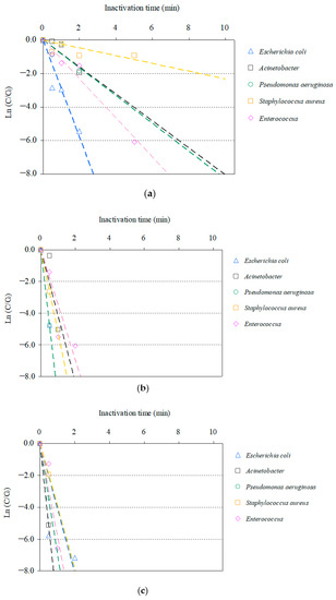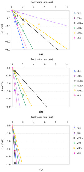 Inactivation of the AMRB and AMSB by O3-based AOPs followed pseudo-first-order kinetics, as previously reported for O3 disinfection of multiple bacteria and viruses [47,48,79,97]. CRE, MDRP, and VRE were rapidly inactivated >99% after 2 min; and ESBL-E and MDRA were inactivated >99% after 5 min in O3/H2O2 treatment. Meanwhile, MRSA was inactivated more gradually than other AMRB, with >99% inactivation after 10 min.