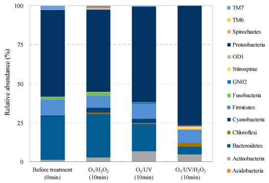 Variations in the bacterial community structure before and after ozonation based on taxonomic affiliation of OTUs are summarized in Figure 3. The bacterial 16S rRNA reads collected from the STP wastewater samples were 142,696 at the start of treatment and 187,671 after O3/H2O2 treatment, 147,834 after O3/UV treatment, and 142,275 after O3/UV/H2O2 treatment (5787 OTUs in total). The STP wastewater samples hosted 40 bacterial phyla, 117 classes, 205 orders, 361 families, and 690 genera.