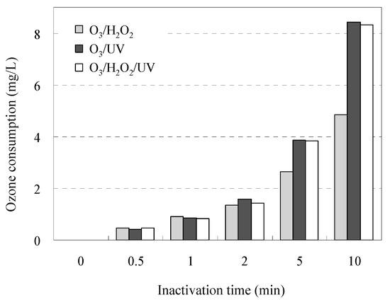 The time-dependent profiles of O3 consumption during inactivation of AMRB and AMSB are shown in Figure 4. The O3/UV and O3/UV/H2O2 treatment consumed up to 1.7-fold O3 (1.2 ± 0.4 times by O3/UV and 1.2 ± 0.4 times by O3/UV/H2O2 as mean) compared with the O3/H2O2 treatment. The difference in the time-dependent profiles associated with the inactivation of AMRB and AMSB is related to O3 consumption by contaminants in wastewater samples during the experiment; these results agree with the distribution of reaction rate constants, as shown in Table 2. These results suggest that a long treatment process is required to achieve sufficient inactivation of a wide range of AMRB species, depending on the concentration of multiple pollutants in the wastewater.