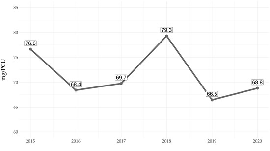 Antimicrobials dispensed by herd veterinarians for use in pig production between 2015 and 2020 are shown in milligrams per population correction unit (mg/PCU, as defined in the European Medicines Agency’s ESVAC report and calculated for the entire national pig herd [6]) in Figure 2. (NB. 1 PCU is approximately equivalent to 1 kg livestock biomass). For all pig production systems overall, the antimicrobial use ranged from a maximum of 79.3 mg/PCU in 2018 to a minimum of 66.5 mg/PCU in 2019.