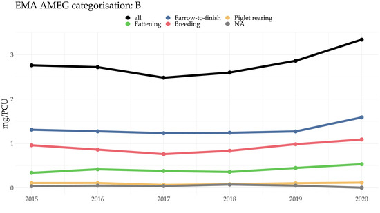 In all production systems, the majority of antimicrobials dispensed were in Category D, with the exception of piglet-rearing units, where a substantial proportion of antimicrobials dispensed were in Category B. For details, see Figure 4 and Section 2.5 and Section 2.8 below. Again, the differences in mass-based versus dose-based metrics became apparent and can be seen very clearly when comparing Figure 4 (mg/PCU) with Figure 6d (DDDvet for piglet-rearing systems).