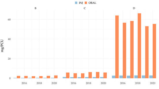 As would be expected, the vast majority of antimicrobials dispensed in all categories for use in Austrian pig production were for oral administration. Category D antimicrobials for oral use ranged from 53 mg/PCU in 2019 to around 66 mg/PCU in 2018, as shown in Figure 5. By mg/PCU, the most frequently dispensed antimicrobial class for oral use in Category D (“prudent use”) were tetracyclines (37.2 mg/PCU (2019)–50.8 mg/PCU (2018)) followed by macrolides (4.0 mg/PCU (2016)–5.2 mg/PCU (2018)) in Category C (“use with caution”) and polymyxins (2.1 mg/PCU (2017)–2.9 mg/PCU (2020)) (“restrict use”) in Category B; for details see Supplementary Figure S1. Injectable antimicrobials were dispensed at very low levels ranging from 0.4–0.5 mg/PCU in Category B to 2.6–2.9 mg/PCU in Category D (Figure 5). Specifically, the most commonly dispensed injectable antimicrobials were found in the classes of aminoglycosides (0.60 mg/PCU (2016)–0.75 mg/PCU (2015), Category C), beta-lactamase-sensitive pencillins (0.54 mg/PCU (2017)–0.60 mg/PCU (2020), Category D), and macrolides (0.27 mg/PCU (2019)–0.31 mg/PCU (2020), Category C), amongst others (Supplementary Figure S1).