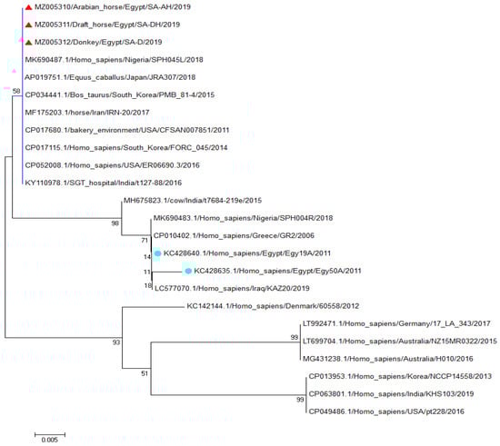Three PCR samples were selected from S. aureus spa (x region) gene-positive samples (one sample from each animal species: Arabian horse, draft horse, and donkey) and their nucleotide sequences were determined to confirm the accuracy of the amplified gene. In this regard, the PCR products were purified using the QIAquick PCR product extraction kit (Qiagen). The Bigdye Terminator V3.1 cycle sequencing kit (Perkin-Elmer, Applied Biosystems, Foster City, CA, USA) was used for the sequence reaction and purified using a Centri-Sep spin column. DNA sequences were obtained with an Applied Biosystems3130 genetic analyzer (HITACHI, Tokyo, Japan). A BLAST® analysis (Basic Local Alignment Search Tool) [26] was initially performed to establish sequence identity with GenBank accessions. The phylogenetic tree was created with the MegAlign module of LasergeneDNAStar version 12.1 [27], and the phylogenetic analyses were performed using maximum likelihood, neighbor joining, and maximum parsimony in MEGA6 [28]. The nucleotide sequences of the S. aureus Spa (x region) gene fragment from the three selected samples were then deposited in GenBank (NCBI) with accession numbers MZ005310/Arab horse/Egypt/SA-AH/2019, MZ005311/Draft horse/Egypt/SA-DH/2019, and MZ005312/Donkey/Egypt/SA-D/2019.