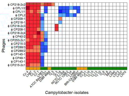 Host range of 18 C. coli-specific phages on 28 Campylobacter isolates with color-coded EOP values. Host range evaluation was performed by spotting serial dilutions of bacteriophages onto NZCYM–soft-agar overlays containing the respective bacterial isolate (◼ C. jejuni, ◼ C. coli). Experiments were performed in triplicate. C. coli 084610 was used as reference strain, and color coding was used to visualize EOP values .