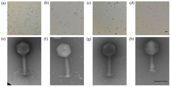 Plaque morphology of the four examined myovirus phages (a–d) and micrographs showing the morphology of the virions (e–h). All four phages, CPL1/2 (a,e), CP218-2c2 (b,f), CP288/3 (c,g), and CP1-1 (d,h), formed clear plaques on C. coli strain NCTC 12667 (a–c) and C. jejuni strain NCTC 12662, respectively (d); scale bar represents 2 mm. The virions consisted of an icosahedral head and a contractile tail structure with tail fibers; negatively stained phage particles with 2% uranylacetate; scale bar represents 100 nm.