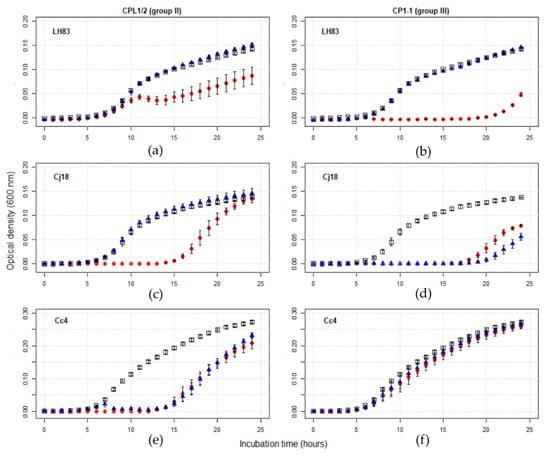 Exemplary growth curve comparison of Campylobacter alone and in presence of two phage concentrations. PKA experiments were performed in a Tecan Spark Microplate Reader. Optical density was measured every hour at 600 nm for 24 h. Curves represent mean OD600 values of three or four experiments, with error bars indicating standard error of the mean. Control curves (□) and PKA curves for MOIinput 10 (●) and 0.001 (▲) are displayed. The observed effects of phages on bacterial population growth could be classified into three groups: either no effect at all (e.g., Cc4 + CP1-1 (f)), limited growth impediment at a high MOIinput only (e.g., LH83 + CPL1/2 (a) or LH83 + CP1-1 (b), Cj18 + CPL1/2 (c)), or growth was impeded at both a high and low MOIinput (e.g., Cj18 + CP1-1 (d) or Cc4 + CPL ½ (e)).