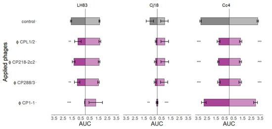 Area under the curve (AUC) values from planktonic killing assays for single-phage applications on three different Campylobacter strains. C. jejuni LH83, Cj18, and C. coli Cc4 were exposed to three group II phages (CPL1/2, CP218-2c2, and CP288/3) or one group III phage (CP1-1) in single-phage planktonic killing assay at an MOIinput 10 (■/■) or MOIinput 0.001 (■/■). Experiments were performed in triplicate or quadruplicate. Dunnett’s test with a 95% confidence level was used to compare the AUC values of the treatment to the control (significance code indicates range of p values: ** 0.001, *** > 0.001). Error bars indicate the standard error of the mean.