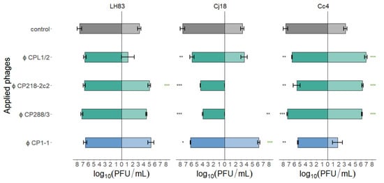 Final phage concentrations after single-phage planktonic killing assays with three different Campylobater field isolates. C. jejuni LH83, Cj18, and C. coli Cc4 were exposed to either one of the three group II phages (CPL1/2, CP218-2c2, and CP288/3) or the group III phage (CP1-1) at MOIinput 10 (■/■/■) or MOIinput 0.001 (■/■/■). Experiments were performed in triplicate or quadruplicate. Dunnett’s test with a 95% confidence level was used to compare the phage concentrations at the beginning of the experiments with those after 24 h (significance code indicates range of p values: * 0.01, ** 0.001, *** >0.001; * final concentration higher than starting concentration). Error bars indicate the standard error of the mean. Control bars represent mean starting concentrations (■/■).