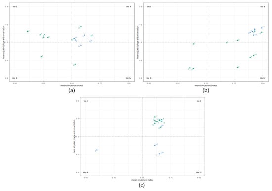For further analysis and increased comparability, a mean virulence index (meanvi) and a mean adjusted phage final concentration (meanc24) were calculated for every phage combination. Both values were plotted against each other in a scatter plot as shown in Figure 6. The meanvi can take any value between 0 and 1, while values for meanc24 range from 0 to 2. Thresholds were defined at a meanvi of 0.5 and a meanc24 of 1.0. These thresholds are represented as dashed lines and divide the scatter plots into four tiles. The meanvi values in tiles I and III represented suboptimal efficacy of the phages, while meanvi values in tiles II and IV represented optimal efficacy. Additionally, meanc24 value ranges in tiles III and IV were interpreted as suboptimal and in tiles I and II as optimal phage replication ability. The concentrations for multiple group II phages were summed up, as the host C. coli NCTC 12667 did not allow for differentiation between group II phages.