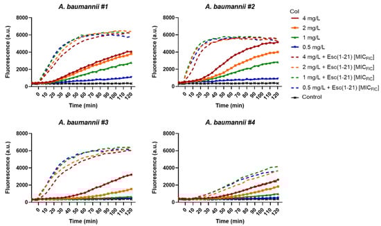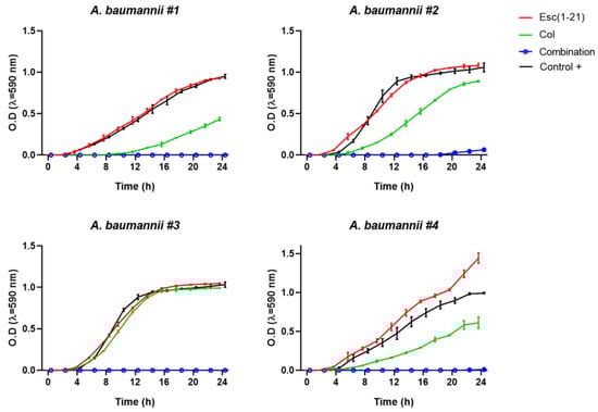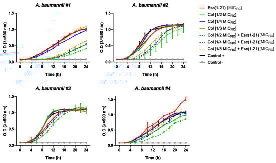 Growth profiles for the #1, #2, #3, and #4 A. baumannii strains treated with colistin (Col), Esc(1-21), or their combination at the MICFIC. Untreated control samples were included for comparison. Results are of the mean ± standard deviation (SD) of three independent experiments.