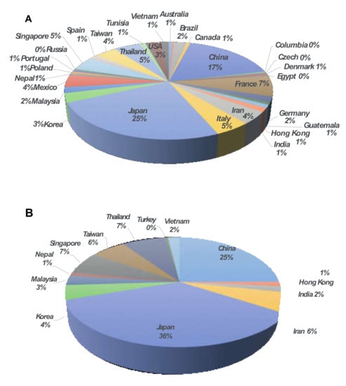 A search of the NCBI database and EMBASE using “IMP and β-Lactamases” for gene encoding blaIMP demonstrated a variety of variants of IMP-type MBL genes as well as species of IMP-carrying organisms. There were 88 variants of IMP-type MBL genes currently deposited on NCBI’s GenBank. These 88 variants were identified in 29 species across 32 countries (Table 1). Interestingly, most of the blaIMP genes identified were from hospital isolates (Table 1). According to the genes submitted to GenBank and the literature search, the detection of blaIMP was frequently reported from Japan (25%), followed by China (17%) and France (7%) (Figure 1A).