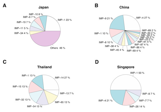 Distribution of blaIMP annotated genes in four countries in Asia: (A) Japan, (B) China, (C) Thailand and (D) Singapore. IMP-N is used to represent blaIMP-N.