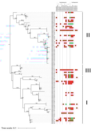 Phylogenetic relationship of blaIMP genes. An unrooted maximum likelihood phylogenetic tree constructed using nucleotide sequences of 88 blaIMP genes with 1000 bootstrap supports was visualised together with antibiotic susceptibility profile of 32 variants of the blaIMP gene. Red squares indicated “resistant” while green squares indicated “susceptible”. IMP-N is used to represent blaIMP-N.