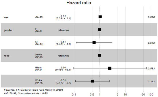The findings of the COX proportional hazard regression model showed that patients’ demographics were not associated with a significant increase in odds of death among COVID-19 patients (Figure 2).
