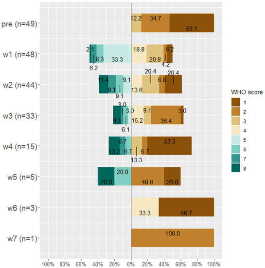 WHO score for all patients (n = 49) before taking Tocilizumab and at weeks 1, 2, 3, 4, 5, 6, and 7 after Tocilizumab administration.